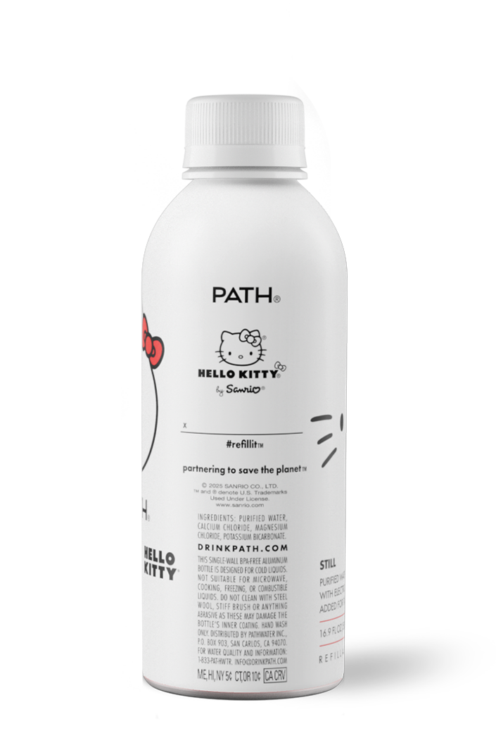 Ultra-purified, reverse osmosis filtered water packaged in a perfect refillable Sanrio designed bottle. Lightweight and made to reuse, this exclusive Hello Kitty® edition encourages you to carry positivity with every refill and choose a lifestyle that’s as sweet to the planet as it is to friends.